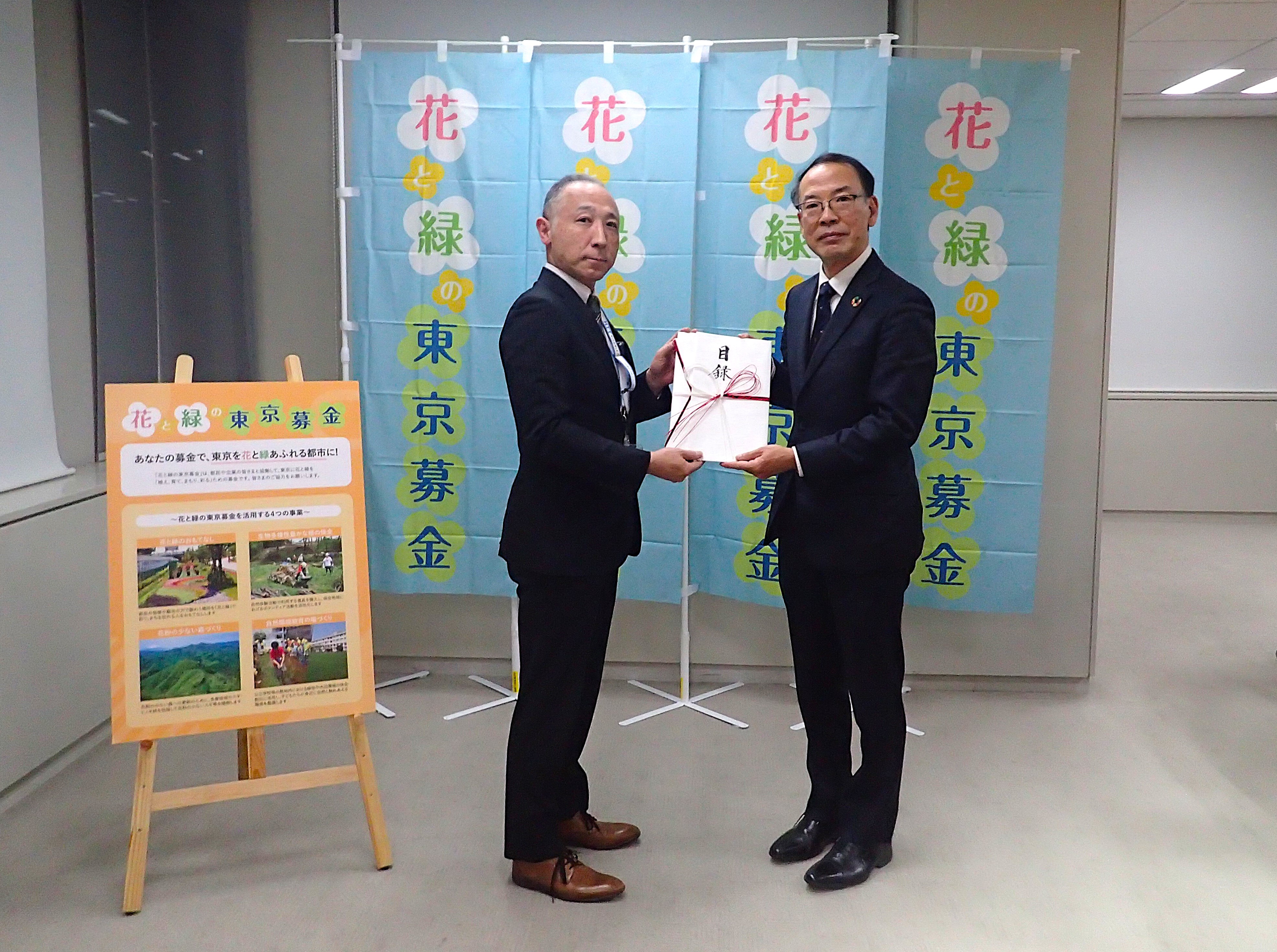 2025年12月19日(金)東京都環境局の皆様にご列席いただき、東京都「花と緑の東京募金」へ寄付金を贈呈しました。「花と緑の東京募金」は緑あふれる都市東京を実現する緑化事業のための募金で、生物多様性豊かな緑の保全への取り組みに活用いただいております。